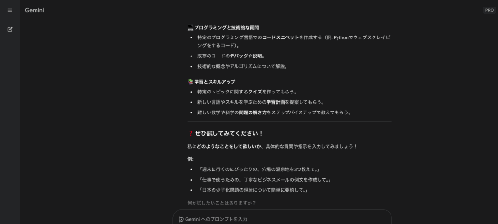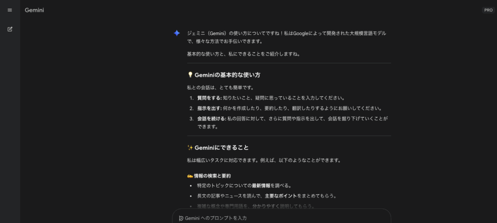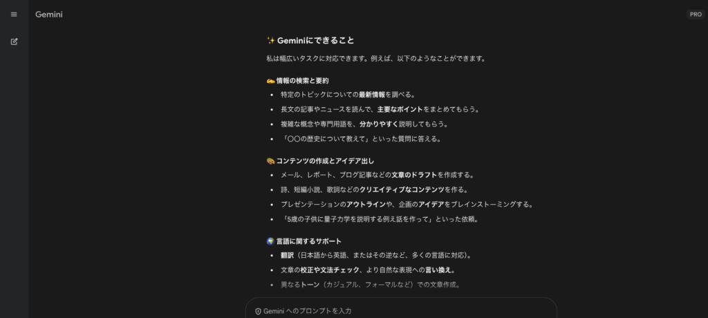 情報の通り、Geminiでは情報の検索や要約をしてくれたり、専門用語等のわかりやすい解説の他、歌詞や短編小説作成、