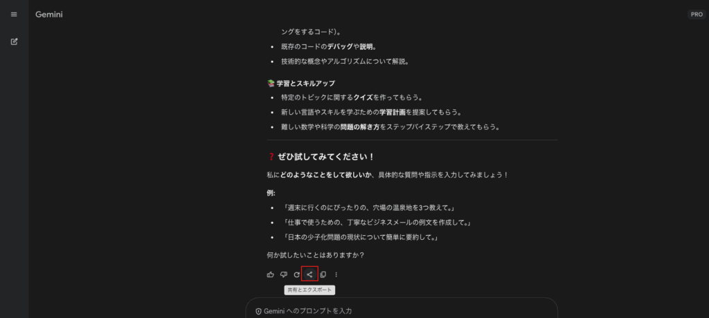 • 下にある共有ボタンを押す事で、Geminiとの会話内容を共有できる